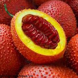 – Quả mọng to, hình bầu dục tròn, dài 15 – 20 cm, đường kính quả 12 – 18 cm, vỏ quả có gai mềm, khi chín mầu đỏ nhạt. Thịt quả mầu đỏ sẫm hay đỏ vàng. Hạt nhiều, xếp thành hàng dọc, hạt dẹt được bao bởi lớp màng mầu đỏ sẫm, hạt mầu đen, vỏ hạt cứng và dầy, mép có răng tù, kích thước hạt dài 25 – 35 mm, rộng 19 – 31 mm, dầy 5 – 10 mm, nhân hạt (nội nhũ) chứa nhiều dầu.